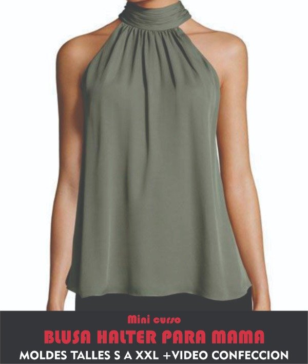 MOLDES BLUSA HALTER EN TELA SEDOSA CON CUELLO ALTO TALLES S A XXL (85 A 135 BUSTO ) Y LISTA DE TELAS SUGERIDAS EN TABLA COMPARATIVA