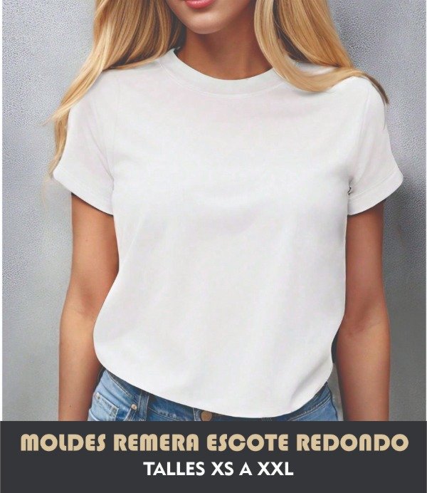 MOLDES REMERA ESCOTE REDONDO DE MUJER, CORTE CLASICO CON SEMIENTALLADO EN CINTURA EN TALLES XS A XXL (85 A 125 BUSTO CADERA) PARA TELAS DE PUNTO A ELECCION