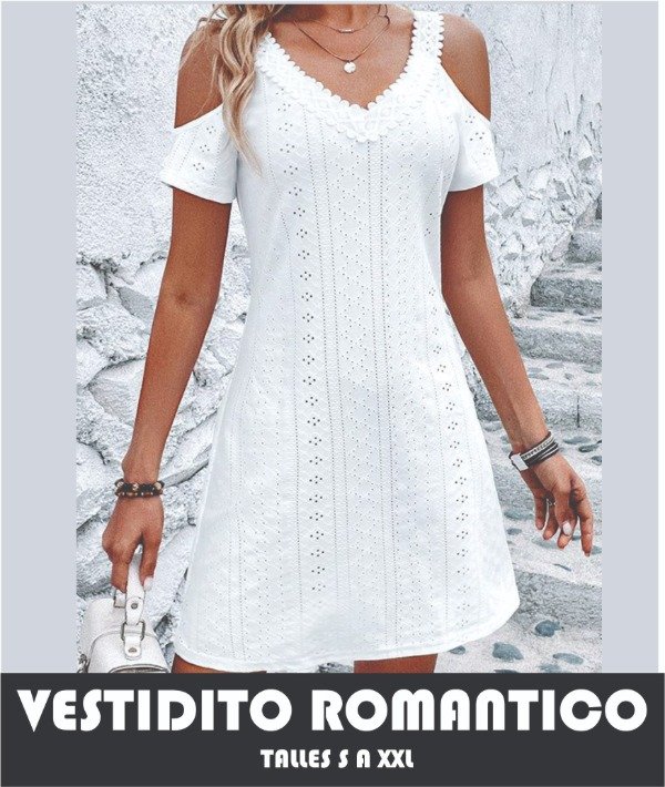 MOLDES VESTIDO ROMANTICO CON DETALLE DE HOMBRO RECORTADO Y ESCOTE V DE PUNTILLA U OTRO MATERIAL TALLES S A XXL (abarca 85 a 130 de cadera)